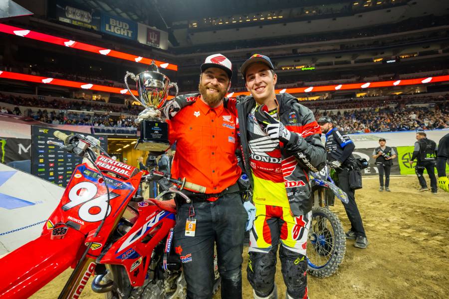 Continuing his dominance of the 2023 AMA Supercross 250SX East Region series, Hunter Lawrence rode his Team Honda HRC CRF250R to yet another win in his first visit to the motorsports-crazy city of Indianapolis, whose soft soil invariably makes for a treacherous, rut-filled track. Through just five rounds, the Australian has already matched his four-win tally from 2022, with more than half of the races still to be run. Meanwhile, the 450SX division cleared its midway point, with Chase Sexton riding well all day. He topped qualifying and his heat race aboard his CRF450RWE before a hard crash in the main event limited him to a 10th-place result.