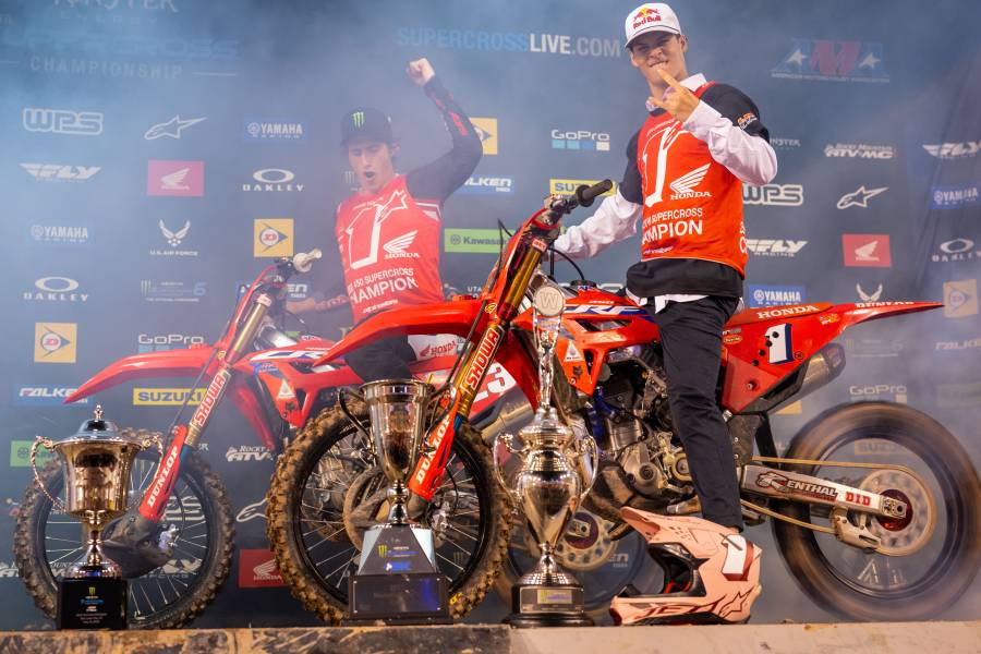 The first two rounds saw Sexton and Jett first and second in the 450 points standings, and Hunter leading the 250 title chase. Jett took the first moto win, while Sexton finished third. Sexton led the first part of moto 2, but a hard fall at about the midway point allowed Jett to move into the lead. Jett led to the finish which ended the evening with a 1-1 score, earning the series’ first-ever 450 Championship and the $1 million prize. It also meant that the inaugural SuperMotocross Title went to Team Honda HRC.