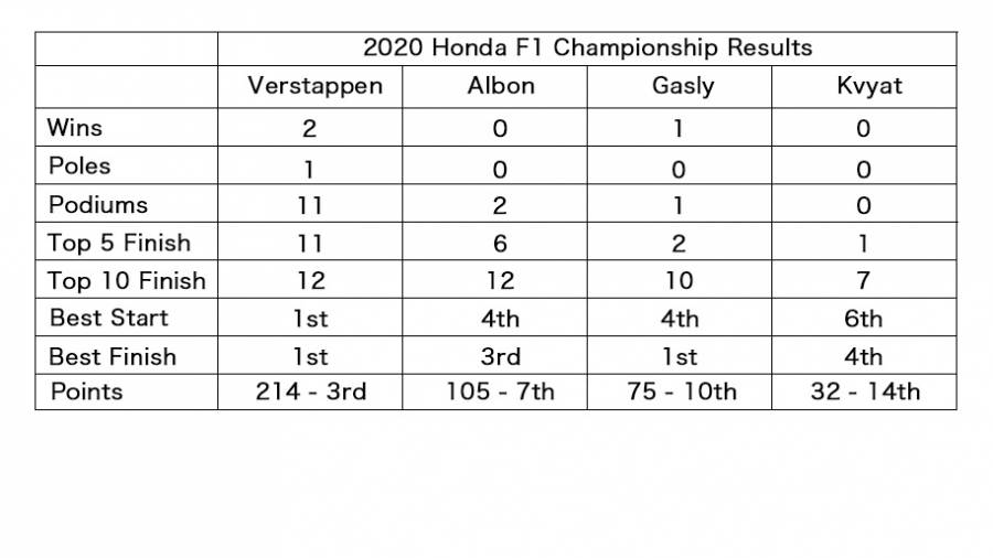 “I would like to thank everyone involved in the Honda F1 program for all their hard work in these difficult times, as well as all our friends at Red Bull and AlphaTauri. Their efforts are much appreciated and thanks must also go to the families that supported them,” said Honda F1 Technical Director Toyoharu Tanabe. “One of our key positives was that we learned from previous seasons, improving our reliability so that we used just the three PUs allowed per driver, taking no PU-related penalties.”
