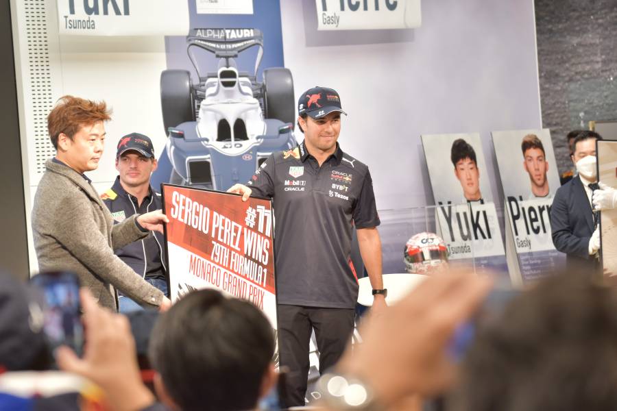 The event started in the evening as light rain fell. As 150 lucky draw winners watched, Max Verstappen and Sergio Perez took to the stage, greeting the visitors, and viewers connected via live broadcast. With photographs displayed on the large screen, Verstappen then shared his feelings on winning the championship last year, and Perez looked back upon his win at last weekend’s Singapore Grand Prix.