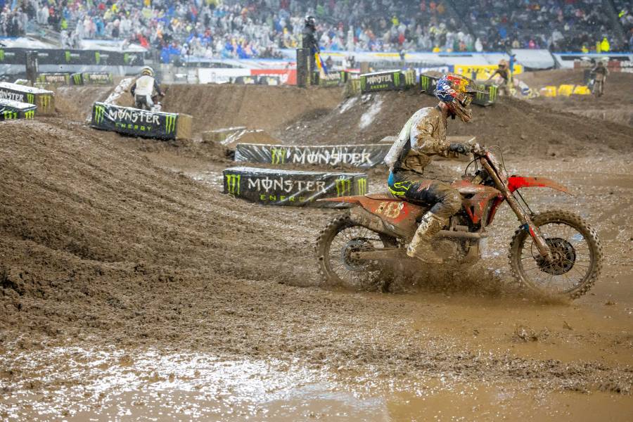 MONSTER ENERGY AMA SUPERCROSS第14戦が、ニュージャージー州イーストラザフォードで開催されました。会場のメットライフ・スタジアムは、隣接するニューヨーク州のアメリカンフットボールチームが本拠地としている多目的競技場。2019年以来4年ぶりに当地を訪れた大会は、雷雨の直撃を受けて決勝スタートが1時間半遅れ、マディコンディションでのサバイバルレースとなりました。