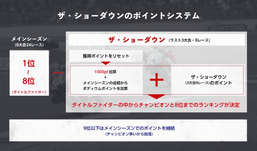 このシステムでは、まず、上位8名のポイントを一旦リセットし、1000ポイントに加え、さらにメインシーズンの中で表彰台に登壇した回数に応じて「ポディウムポイント」が付加されます。配点は優勝で5点、2位で3点、3位で1点となります。