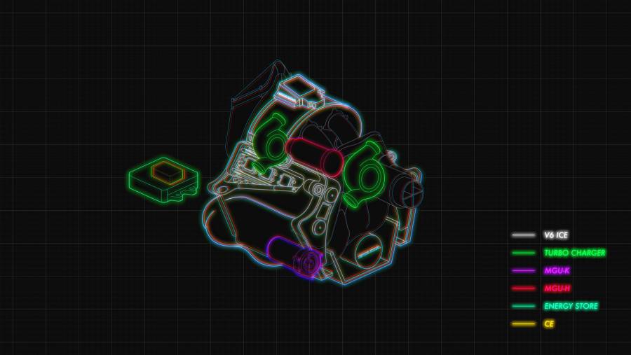 「Motor Generator Unit, Heat」の略で、Heat=熱を回生するコンポーネントです。回転により発電する原理はMGU-Kと同じですが、こちらはエンジンの排気で発電を行い、そのエネルギーはESかMGU-Kへと送られます。