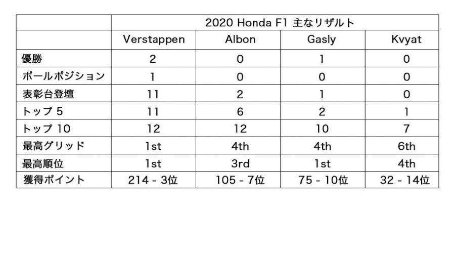 フェルスタッペンはシーズン2勝、ポールポジション1回を獲得し、11回の表彰台登壇を果たしましたが、これはHondaドライバーとして1991年のアイルトン・セナの12回に次ぐ数字です。また、アルボンはキャリア初を含む2回の表彰台登壇。クビアトは第13戦での4位フィニッシュのほか、シーズン最後の3連戦ではすべて予選トップ10入りを果たしました。