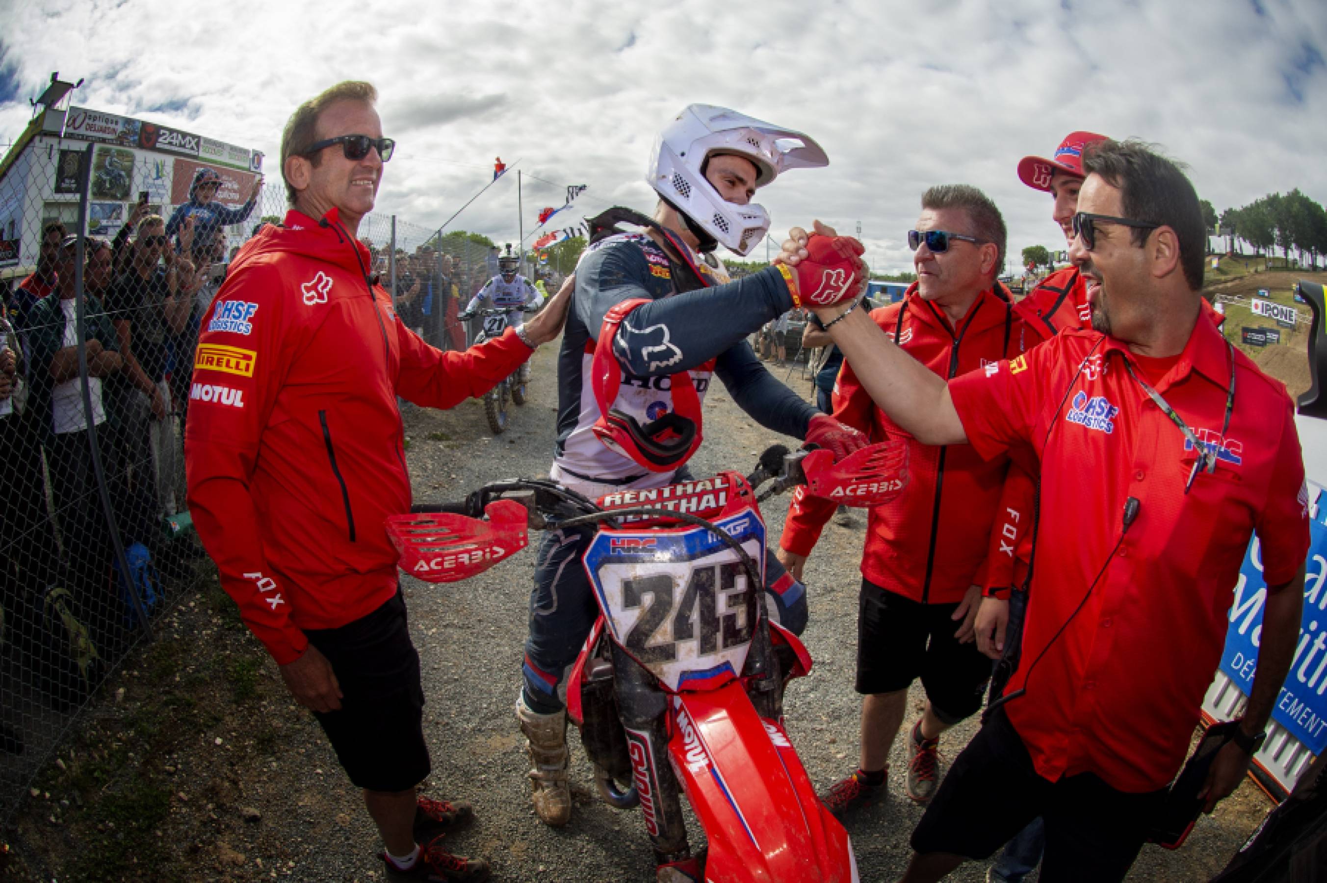 2024年10月6日、日曜日の午後遅く。第77回モトクロス・オブ・ネイションズが開催されたイングランド南部のマタリー・ベイズン・サーキットは、雨の霧に暗く覆われていました。シーズン最後の国際イベントとなる最終レースで、ティム・ガイザーはラストコーナー、最後の数メートル、数秒で圧巻のパフォーマンスを見せ、会場を熱狂の渦に巻き込みました。MXGP総合ランキング2位のHRCスター、ガイザーは、同じHondaライダーでAMA 450SXおよびSMXチャンピオン、ジェット・ローレンスを最後から2番目のカーブで猛然と抜き去り、2024年のフィナーレを飾るチェッカーフラッグを劇的に獲得。この日、1-1の完全勝利を達成しました。CRF450Rライダー同士の手に汗握る一騎打ちは、雨に濡れながらも総立ちとなった大観衆の前で最高の形で幕を閉じました。この偉業は、まさに彼の強靭なアスリートとしての真価を示す圧巻のパフォーマンスであり、長いグランプリシーズンと国際イベントを締めくくる最高の瞬間となりました。本シーズンでもガイザーとHRCは、この危険かつ途方もなく過酷なスポーツの頂点で、再び最高峰の基準を打ち立てたのです。