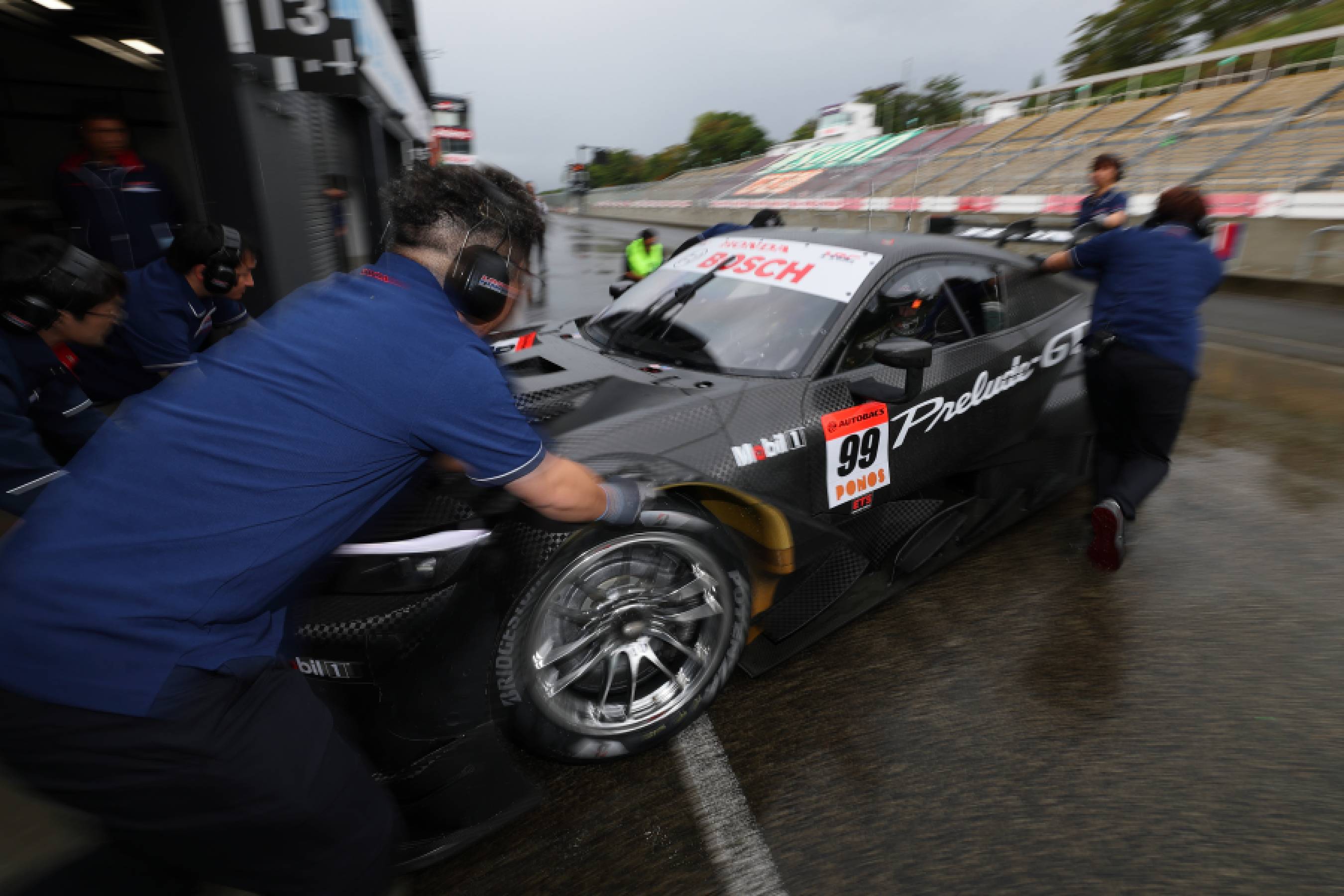 翌10月1日(水)にはシェイクダウン(初走行テスト)を実施しました。走行開始は9時30分の予定でしたが、直前に土砂降りの雨となり、いったん走行を見合わせることに。その後、雨が上がるとマシンはコースインし、まず牧野任祐選手がステアリングを握り、続いて山本尚貴選手がドライブしました。