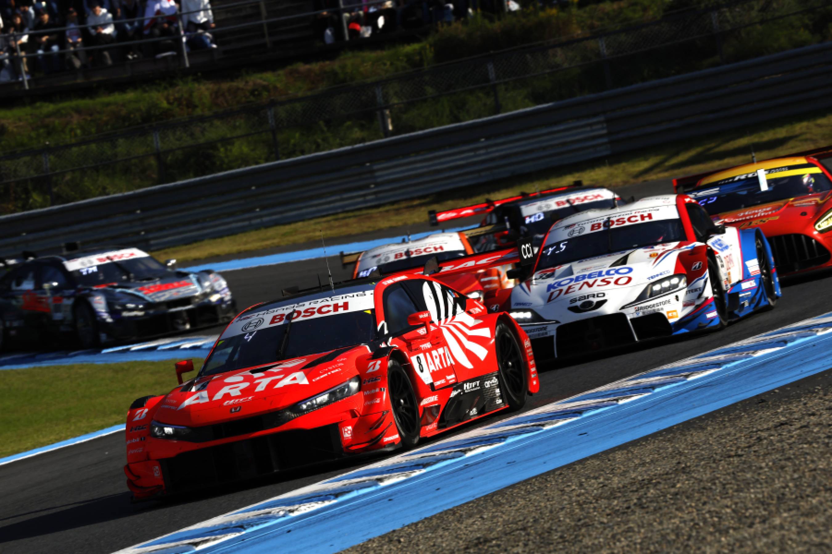 決勝日は晴天となり、ドライコンディションでレースは始まりました。ポールポジションからスタートした64号車(伊沢/大草)は、序盤はポジションを守りますが、徐々に順位を落としていきます。一方、8号車(野尻/松下)は予選順位を守りきり、CIVIC TYPE R-GT勢最高位の2位でチェッカーフラッグを受けました。100号車(山本/牧野)も6位に食い込み選手権ポイントを稼ぎましたが、ランキングではトップから18点差の2番手。チャンピオン獲得の望みをなんとかつないで最終大会に挑みます。