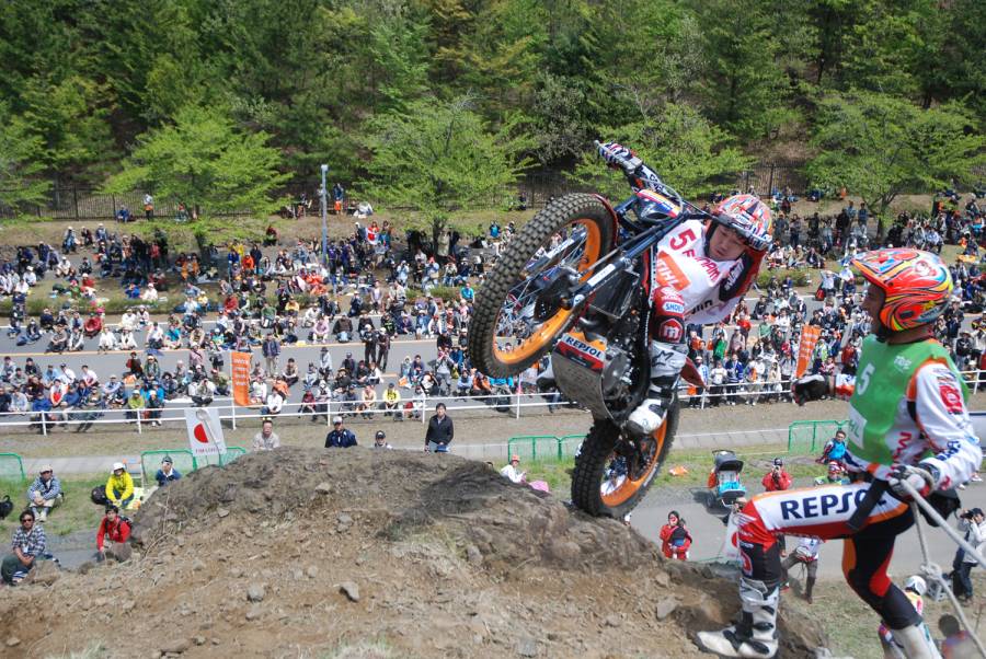 Newly-crowned Fujinami had the potential to defend his title. But, on a bike that had more maturing ahead of it, Fujinami had a difficult season. Many spectators wanted to see Fujinami defend his title, and Japanese fans looked forward to his triumphant return in the Japan trial. With such high expectations, Fujinami performs his best. The Japan trial is Fujinami’s lucky round. The crowd’s cheers at his every move give him more strength.